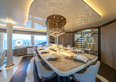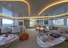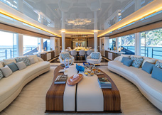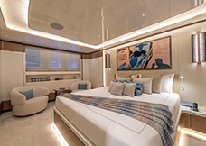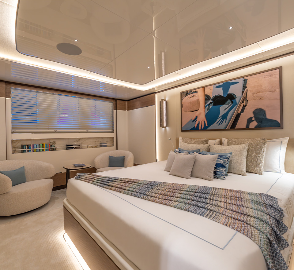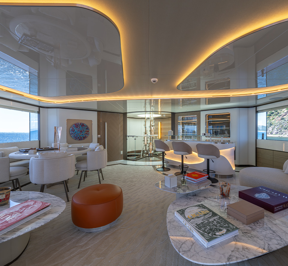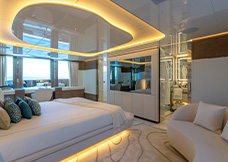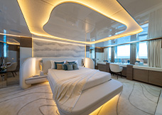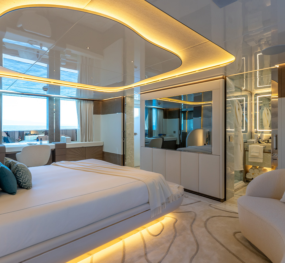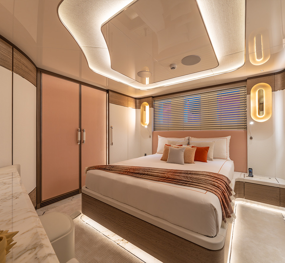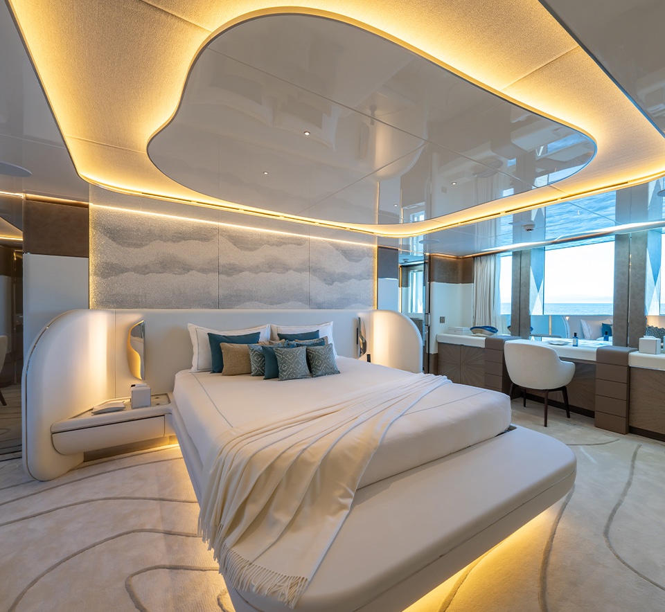 The interior design, featuring clean organic lines complemented by indirect lighting, is by Hot Lab. The yacht, featuring eucalyptus wood finished with leather and glossy lacquer, has four guest cabins, one VIP cabin, and one master cabin.