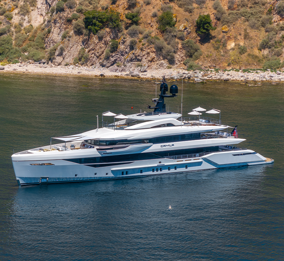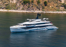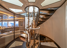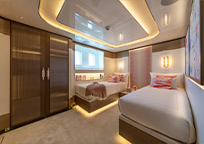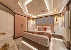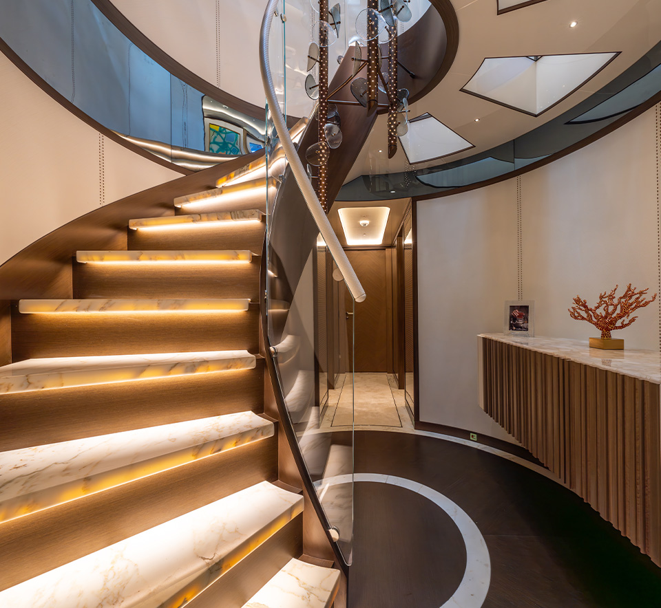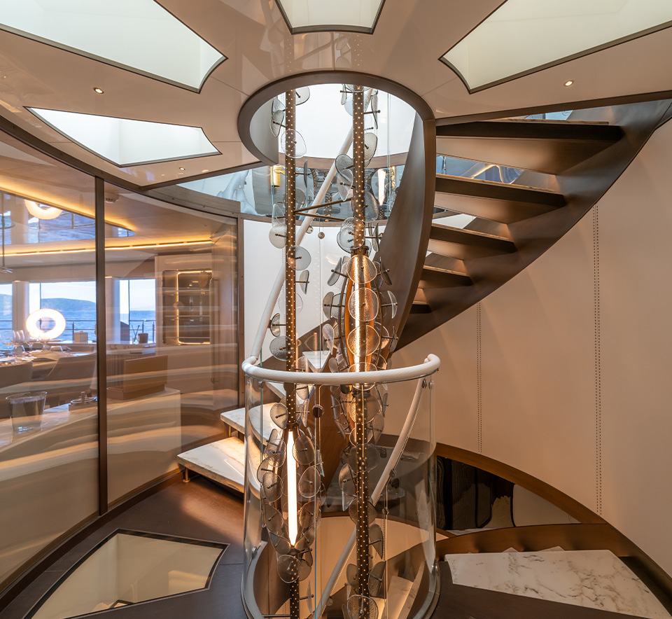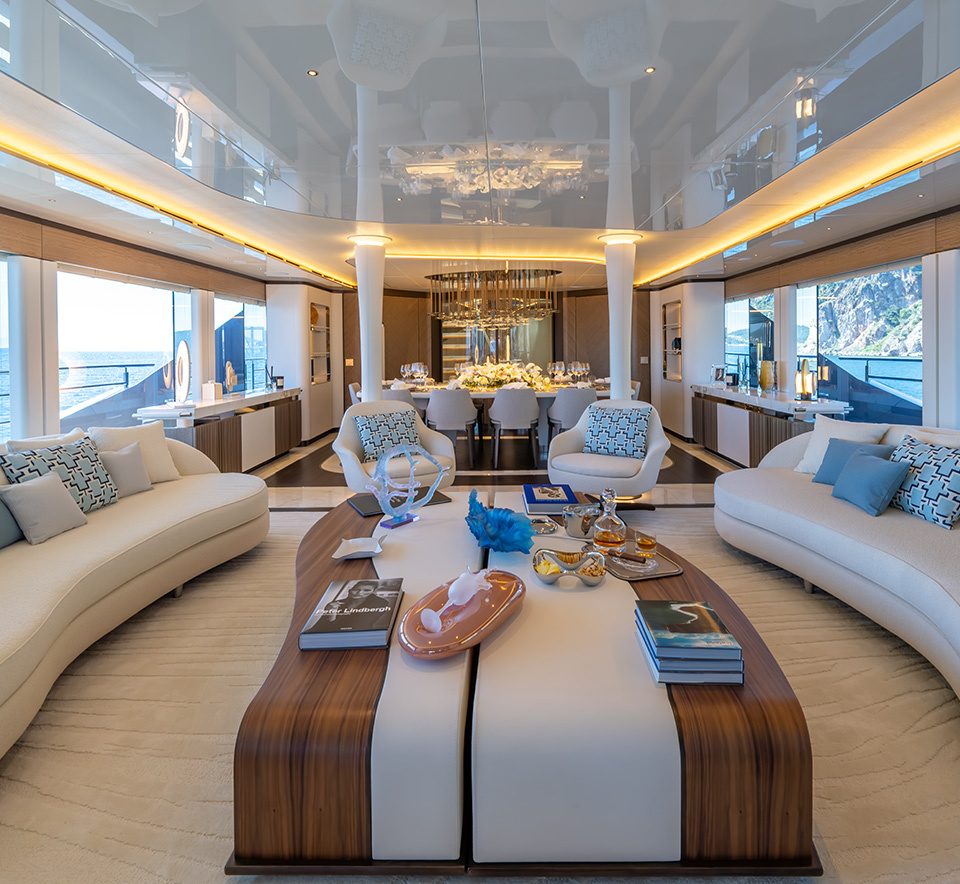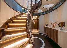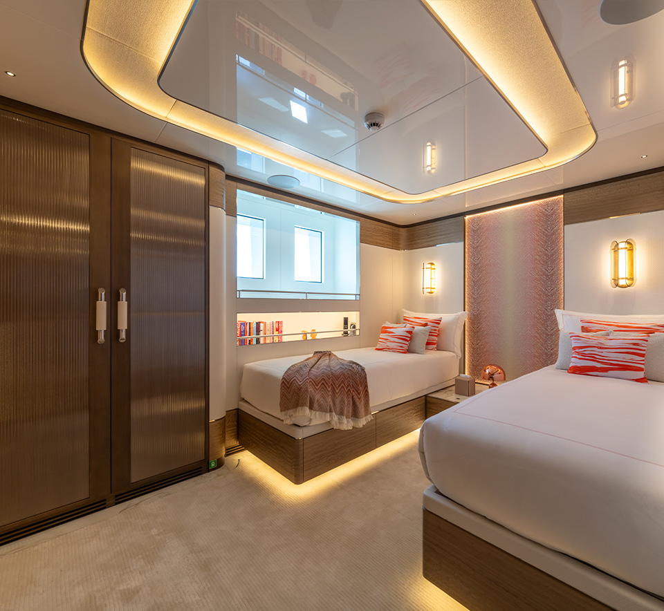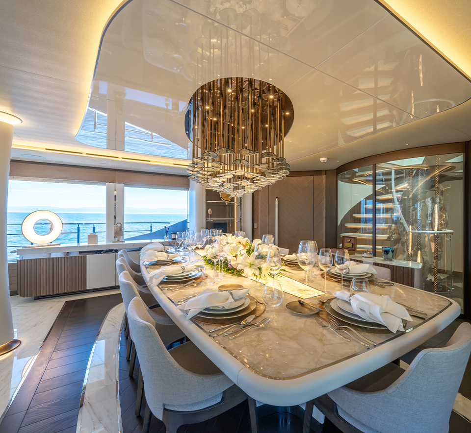 The interior design, featuring clean organic lines complemented by indirect lighting, is by Hot Lab. The yacht, featuring eucalyptus wood finished with leather and glossy lacquer, has four guest cabins, one VIP cabin, and one master cabin.