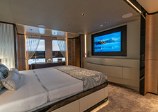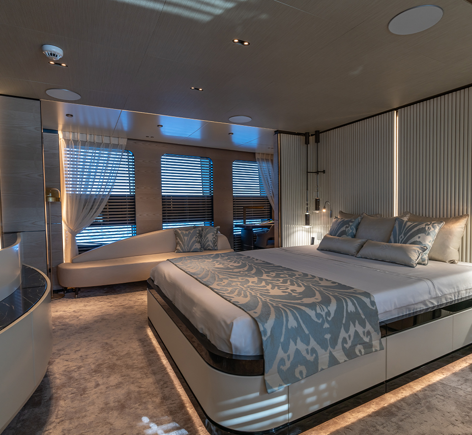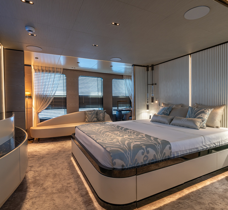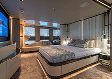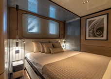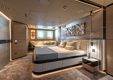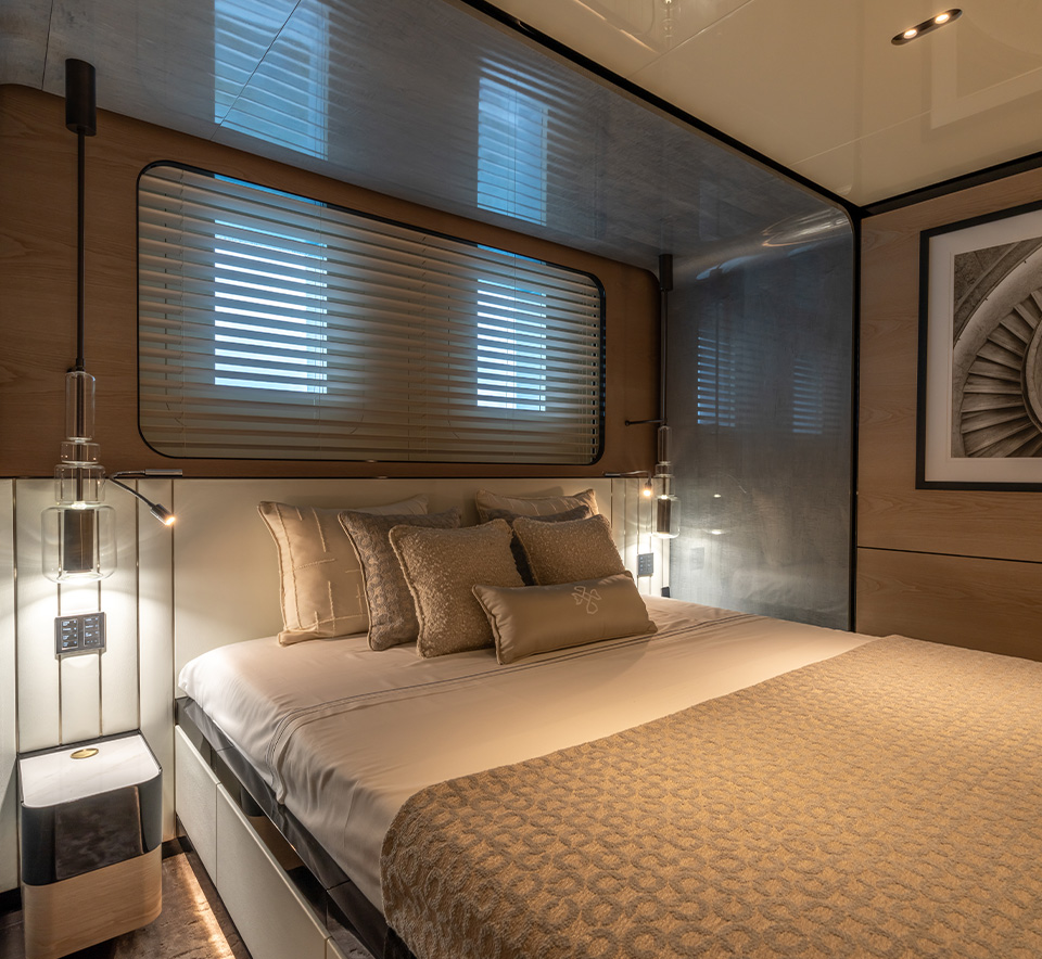 complement the light wood veneers and lacquered panels. The boat features three guest cabins, one VIP