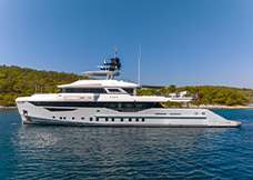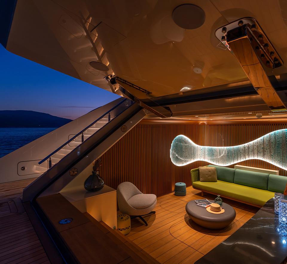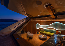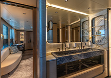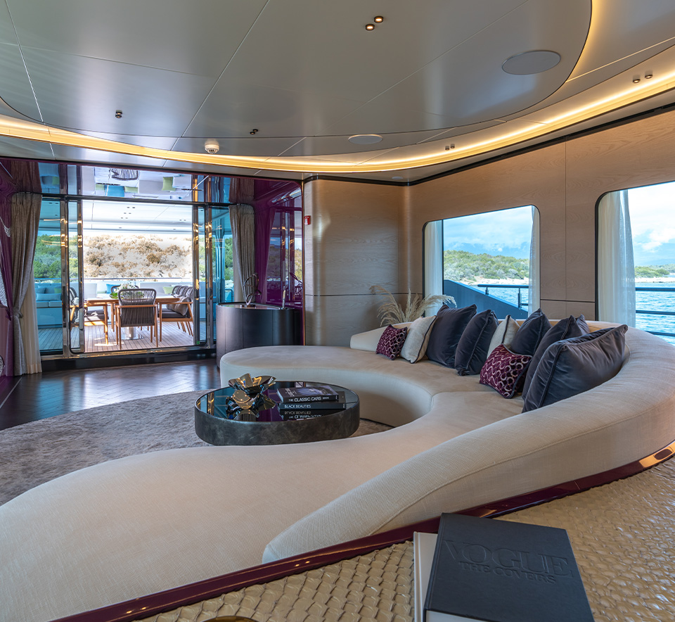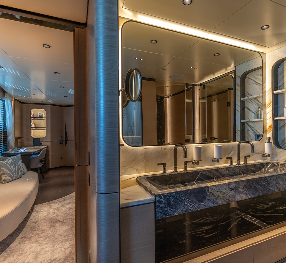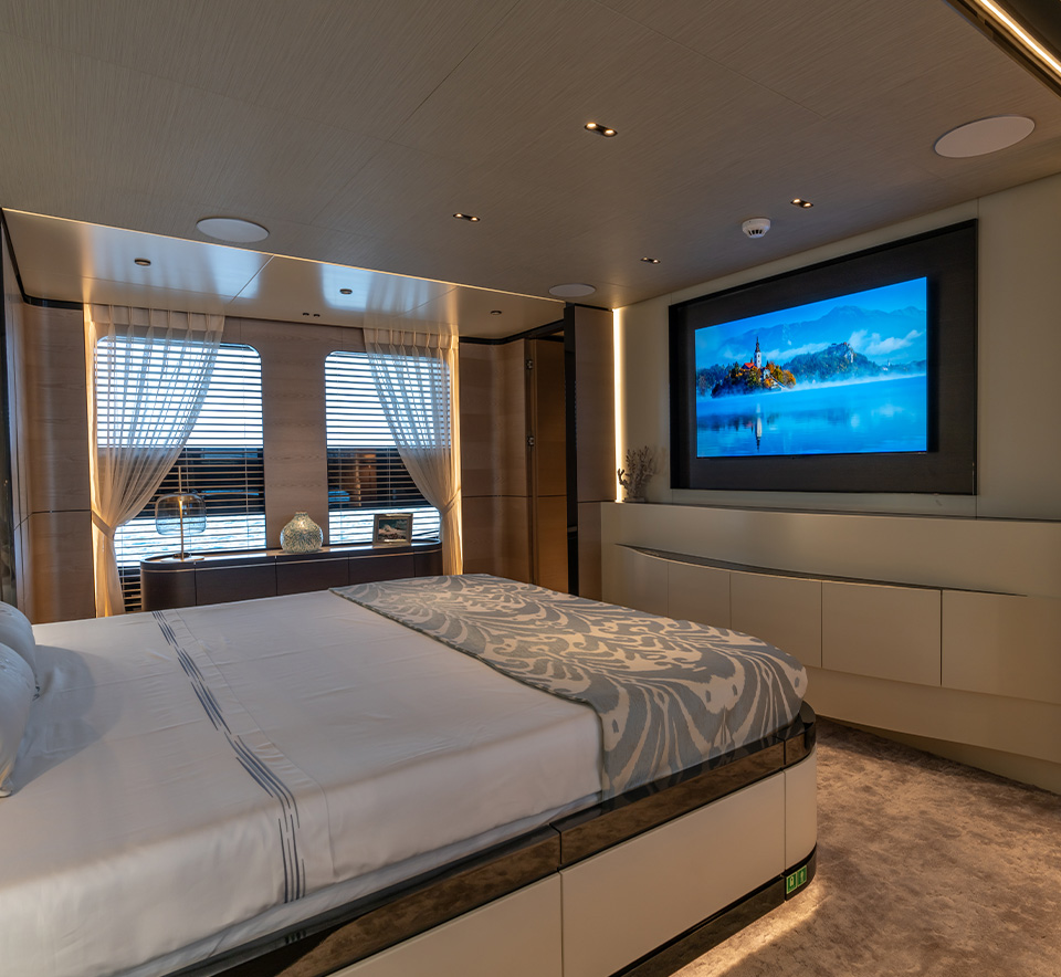 complement the light wood veneers and lacquered panels. The boat features three guest cabins, one VIP